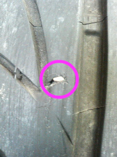なんとなく、右後ろのタイヤを見た。 ペタンと薄くなってる・・・ パンクしてるよ!|||||/( ̄ロ ̄;)\||||||| まじ~~? ちっ、しょうがねえ( `д´) ケッ! とりあえずそこだけ純正のに換えて、タイヤ屋に持っていこうと。 で、外したのをよ~く見たら、これですかね・・・ ここならパンク修理で直るさね、と楽観視。 で、タイヤ屋持ってったら、ここじゃなかったのね。 サイドウォールにグサリと刺さってるモノあり。 なんじゃこりゃーと引っこ抜いたらプシューーーッ! オマエかーーー!!!!(#゜Д゜)ゴルァ!! あああああ・・・そこは修理できないのよ・・・ というわけで、1本だけ新品買った。 買わねばなるまい。放っておくことなど出来ぬ。 デカイので在庫なくて取り寄せ。 まあそうだろう。 お値段が、覚悟してたが高い。 覚悟してたが痛い出費だ・・・(/TДT)/あうぅ・・・・ 1本だけ純正。 かっっこわるー